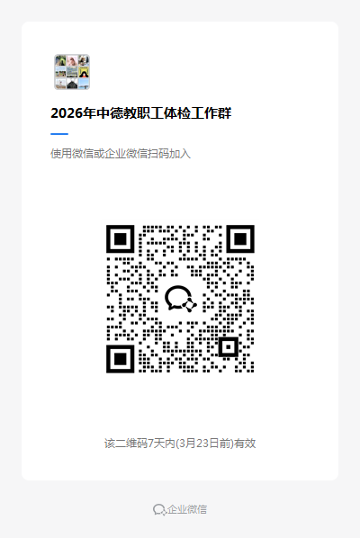 2.2026年体检工作继续沿用原体检群(已更名,迁移至企业微信),请各部门、二级学院确定负责此项工作的人员扫下方二维码加入此群,方便体检事宜解答。(二维码7天内有效,请老师们尽快加入)