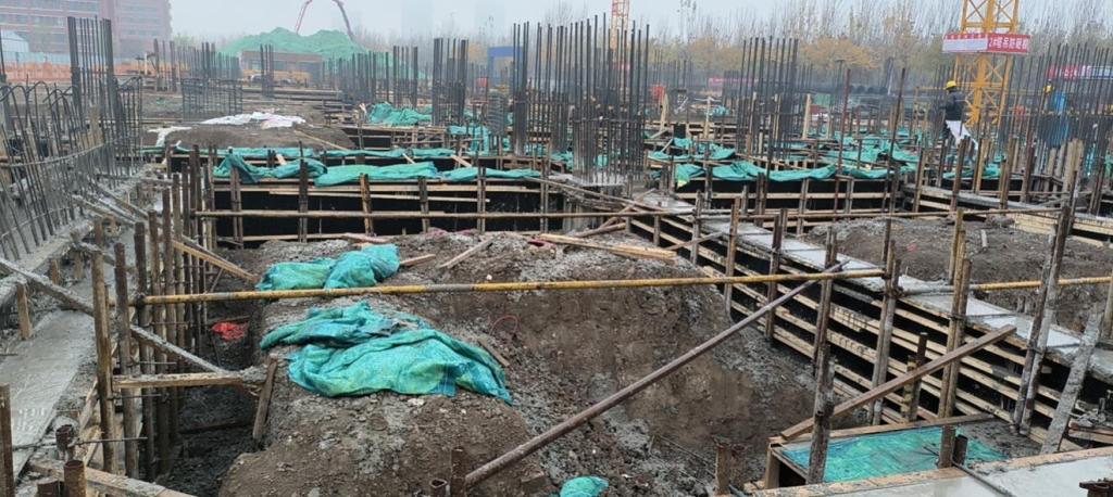 设备楼:承台模板支设完成至100%,加固完成至20%;梁底模板支设完成至100%,加固完成至20%;梁侧模板支设完成20%,加固完成20%;柱插筋绑扎完成100%;地梁钢筋绑扎完成至80%。